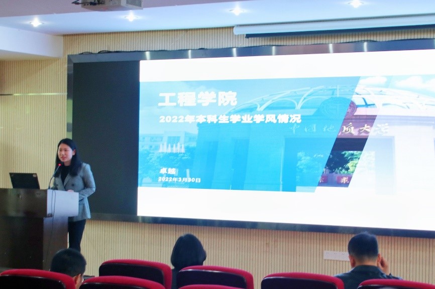 倪晓阳副院长对本科生教风学风建设提要求。她从本科生教学工作的角度,要求任课老师要将思政元素融入课堂,注意学生实习期间的疫情防护和人身安全。她指出,学院近期将成立查课督导组,全覆盖的进行查课,进一步完善学院学风建设工作体系。班主任是学生学风建设的重要力量,是学生大学期间的领路人,要努力关心学生,把“大国担当”和“工匠精神”传递给学生。